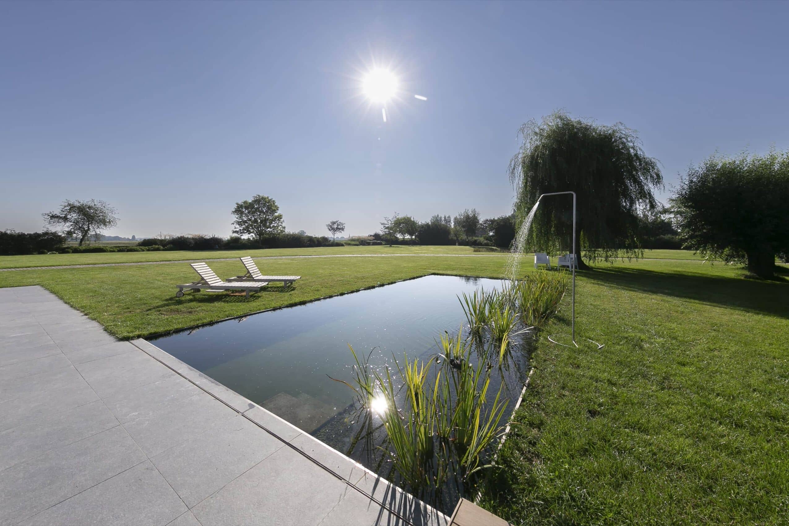Biologische zwemvijver met hoge waterrand en fijne grasrand